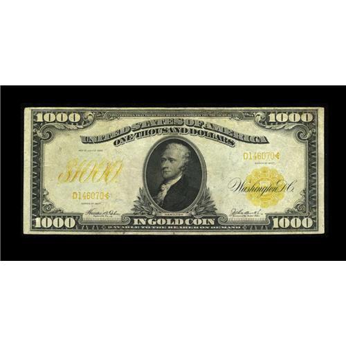 <B>Fr. 1219e $1000 1907 Gold Certificate Fine.</B></I> This is the most common of the 1907 $1000 Gold Certificates. It has the appearance of a problem-free find, but there are two minor repairs--one at the top center, and a second at the upper right corner. Neither seem to involve replaced paper, but are simply scuffs that have been lightly redrawn. Not at all unattractive for the grade, and likely to sell for a sensible and affordable price.<BR><I>From The Bill and Kathy Stella Currency Collection</B></I><BR><BR><b>Shipping:</b> Coin/Currency (<a target="_blank" href="http://www.heritageauctions.com/common/shipping.php">view shipping information</a>)