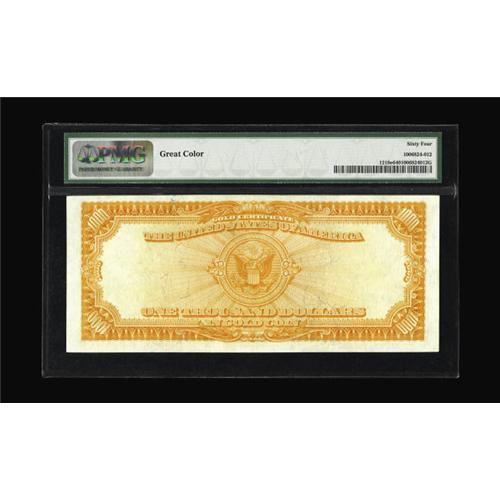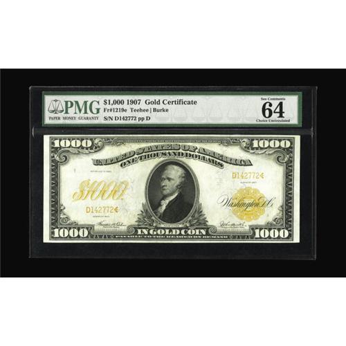 <B>Fr. 1219e $1000 1907 Gold Certificate PMG Choice Uncirculated 64.</B></I> PMG has commented on their holder "Great Color"...and this beauty certainly has that! It's the basic "type" note of the 1907 thousand dollar Gold Certificates, with about 40 pieces known in all grades combined. Only five of the forty notes are listed as uncirculated, including this piece. One of the other Uncirculated notes just recently auctioned in a PMG 63 holder for $150,000, and we would expect this superior example to easily reach and quite possibly exceed ...