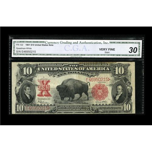 <B>Fr. 122 $10 1901 Legal Tender CGA Very Fine 30.</B></I> A dark overprint and white paper save for a strip along the top margin are characteristics of this Bison.