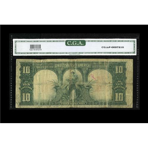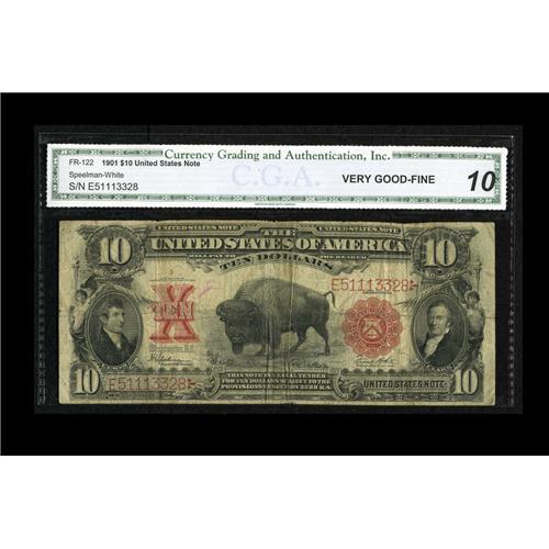 <B>Fr. 122 $10 1901 Legal Tender CGA Very Good-Fine 10.</B></I> Despite moderate circulation and wallet folds, the face design remains strong and colorful. A light break at one of the folds is noted for accuracy.