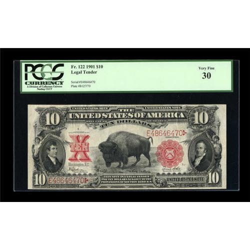 <B>Fr. 122 $10 1901 Legal Tender PCGS Very Fine 30.</B></I> We are almost to the point with this issue that we may have a complete grading set in this sale. This is another colorful, well embossed Bison that is problem free.<BR><BR><b>Shipping:</b> Coins & Currency (<a target="_blank" href="http://www.heritageauctions.com/common/shipping.php">view shipping information</a>)