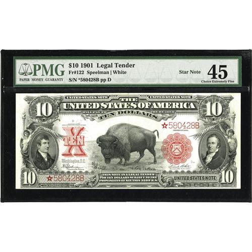 <B>Fr. 122 $10 1901 Legal Tender Star Note PMG Choice Extremely Fine 45.</B></I> The Bison stars are far from common with this example showing three evenly spaced folds.
