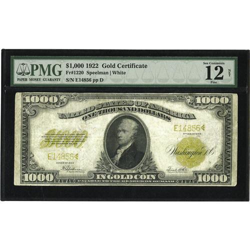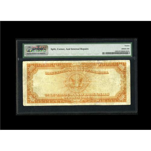 <B>Fr. 1220 $1000 1922 Gold Certificate PMG Net Fine 12.</B></I> This note is new to the census and carries these PMG comments on its label, "split, corner, and internal repairs." The orange overprint is hazy. Still popular enough to command bids in the range of...