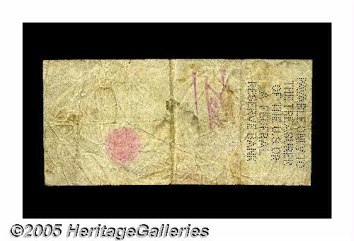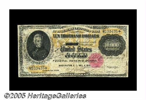<B>Fr. 1225 $10,000 1900 Gold Certificate Very Good-Fine.</B></I> This unredeemable, ultra-high denomination Gold Certificate was acquired early on by Jim O'Neal, and later upgraded by the lovely piece in the previous lot. This note is problem-free for the grade with good color remaining. The surfaces are perfectly natural.