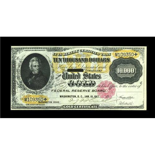 <B>Fr. 1225 $10000 1900 Gold Certificate Choice New.</B></I> This note was not intended for circulation but was used within the Federal Reserve System. Unlike other notes, the back is blank and there are perforation cancellations at the left in the portrait that says this note is payable only to the treasurer or a Federal Reserve Bank. This is a very colorful and bright note with a small amount of wrinkling visible. The margins are full with a bit of tightness at left and the overprints are very deep.<BR><BR><b>Shipping:</b> Coin/Currency (<a target="_blank" href="http://www.heritageauctions.com/common/shipping.php">view shipping information</a>)