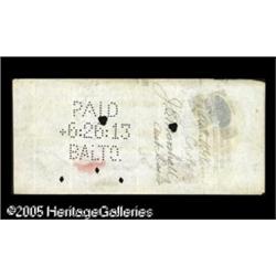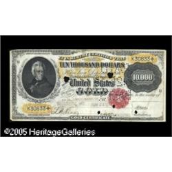 <B>Fr. 1225 $10000 1900 Gold Certificate Extremely Fine, Repaired.</B></I> This example of this unredeemable high-denomination note has been canceled with several varieties of punch cancellations, one of which fell through Jackson's face. The cancellation has been repaired by taping a piece of a different type that bore the same portrait to replace the missing piece. This example bears the much scarcer Napier-McClung signature combination. Lot:16801