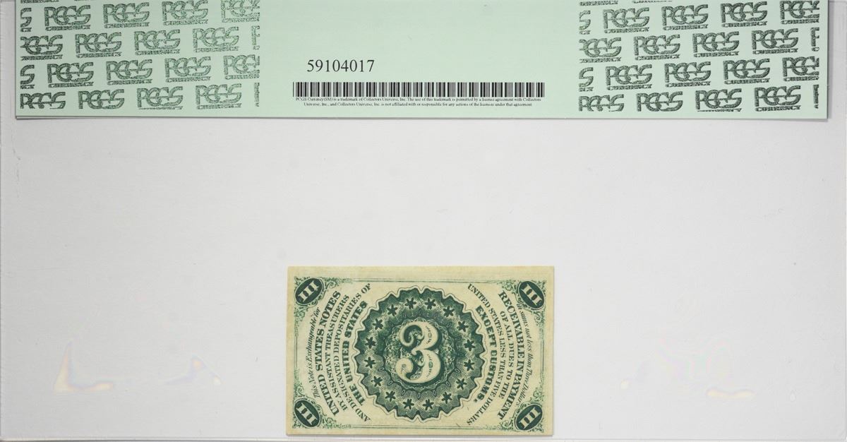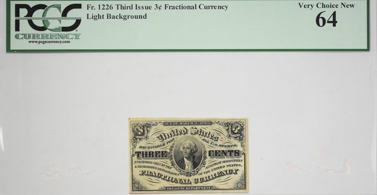 Fr. 1226. 3 Cent. Third Issue. PCGS Currency Very Choice New 64. These light background notes are quite difficult in Uncirculated grades and this offering borders on the Gem grade level.