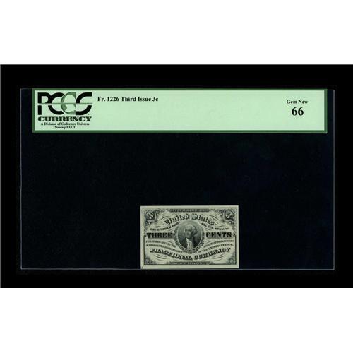 <B>Fr. 1226 3¢ Third Issue PCGS Gem New 66.</B></I> A lovely 3¢ Fractional with broad margins, terrific eye appeal, and a partial face-plate number in the lower-left corner. Formally Lot 206 of CAA's May 1996 sale.<BR><BR><b>Shipping:</b> Coin/Currency (<a target="_blank" href="http://www.heritageauctions.com/common/shipping.php">view shipping information</a>)