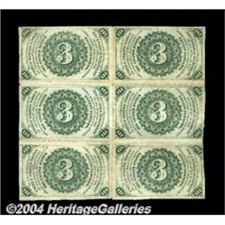 Fr. 1226 3c Third Issue Block of Six Extremely Fine. Each note individually grades About New, but the folds between notes are a bit heavy, bringing the grade of the block as a whole down a bit. Three cent multiples have mostly been cut for the individual notes, making this item scarcer than it had been just a few years ago. <BR><BR><B>Important notice:</B> Heritage usually auctions material at the rate of 200-250 lots per hour. On some occasions eBay Live bid software or the Internet may not be able to keep up with the pace of the auction. We recommend placing a realistic absentee bid now as insurance to avoid disappointment. Occasionally the auctioneer may eliminate or reject an eBay Live bid, and the auctioneer may also reopen a lot after the close of the eBay live bidding (usually because we missed an audience bid), and may reject your bid even if it shows you as the winning bidder. By bidding via eBay Live, you agree that Heritage may award the lot to another bidder at its sole discretion under the circumstances described above or any other reasonable circumstances. Since eBay bids are not shown to us until we open the lot on the floor, we treat those bids just like floor bids. In most cases the floor responds before the eBay bid is presented to us, due to Internet lag time, so for consistency we have made it a policy that floor bids are always considered first over tie eBay live bids. Also please note that all Heritage lots purchased through eBay Live carry a 20% Buyer's Premium. Please make sure you read the Terms and Conditions before you bid. <BR><BR><B>IMPORTANT ANNOUNCEMENT ABOUT RESERVES:</B> Heritage now divulges all reserves on its web site 7 days before every auction. If you want to know whether the reserve on this lot has been met, and if not, what the reserve amount is, please visit this lot page on the HeritageCoin.com web site, or email: bid@HeritageGalleries.com