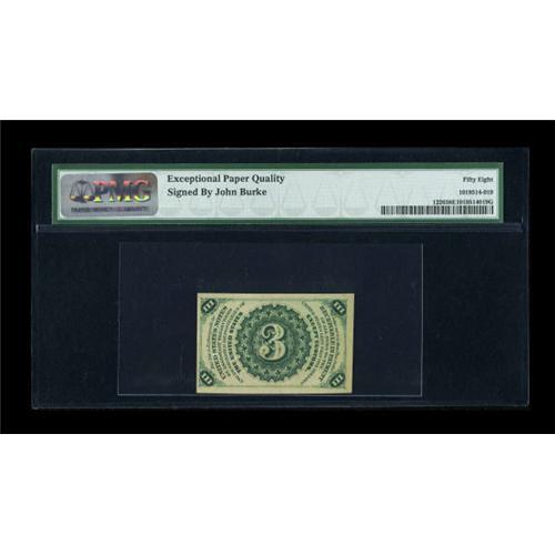 <B>Fr. 1226 3c Third Issue Courtesy Autograph PMG Choice About Unc 58 EPQ.</B></I> John Burke has penned his name for posterity on this lightly handled note.<BR><BR><b>Shipping:</b> Coins & Currency (<a target="_blank" href="http://www.heritageauctions.com/common/shipping.php">view shipping information</a>)