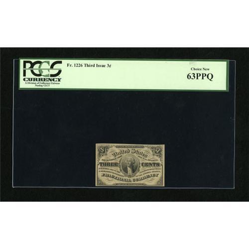 <B>Fr. 1226 3c Third Issue PCGS Choice New 63PPQ.</B></I> Three nice margins share this note with a fourth tight at the bottom.<BR><BR><b>Shipping:</b> Coins & Currency (<a target="_blank" href="http://www.heritageauctions.com/common/shipping.php">view shipping information</a>)