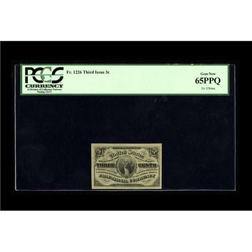 <B>Fr. 1226 3c Third Issue PCGS Gem New 65PPQ.</B></I> Exceptionally wide margins encircle this Ex-O'Mara note.<BR><BR><b>Shipping:</b> Coin/Currency (<a target="_blank" href="http://www.heritageauctions.com/common/shipping.php">view shipping information</a>)