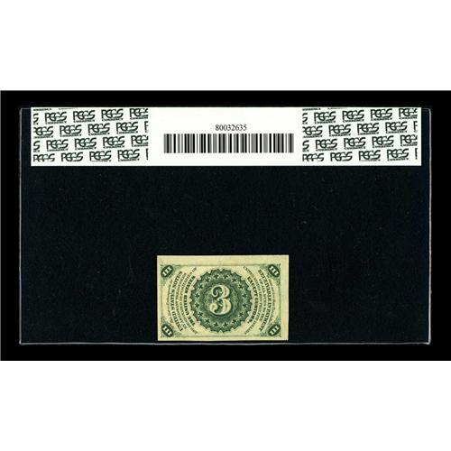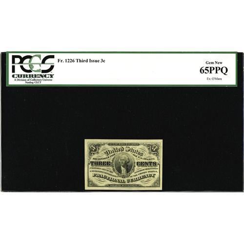 <B>Fr. 1226 3c Third Issue PCGS Gem New 65PPQ.</B></I> Wide margins encircle this note that is ex-O'Mara.