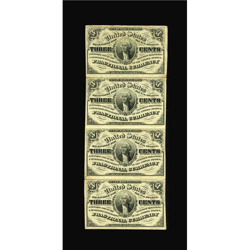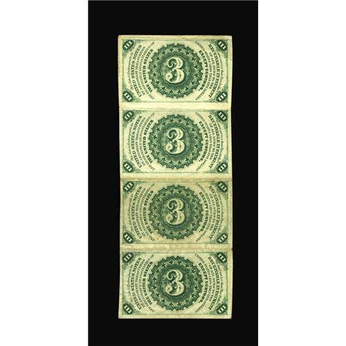 <B>Fr. 1226 3c Third Issue Vertical Strip of Four Extremely Fine.</B></I> Folded between each note and lightly circulated.<BR><BR><b>Shipping:</b> Coins & Currency (<a target="_blank" href="http://www.heritageauctions.com/common/shipping.php">view shipping information</a>)