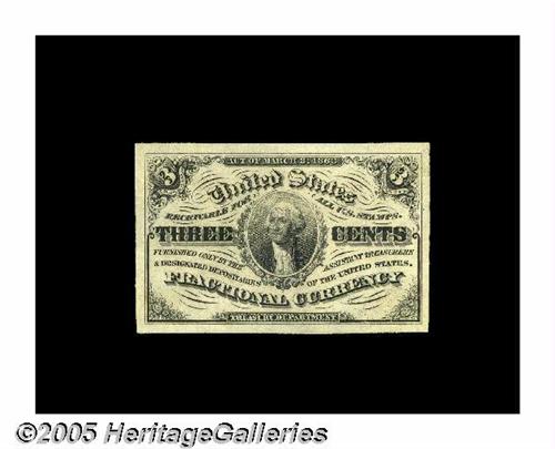 <B>Fr. 1226 Milton 3R3.1a 3¢ Third Issue Gem New.</B></I> Superb from the face with huge margins, but the back is centered low and to the left, although it is well clear of the frame line.