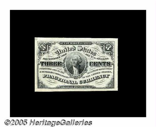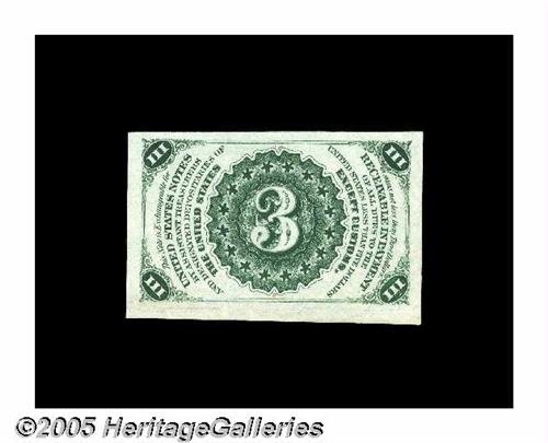<B>Fr. 1226 Milton 3R3.1a 3¢ Third Issue Superb Gem New.</B></I> An absolutely flawless Three Cent note, with boardwalk margins, bright colors and face-plate number 55 in its upper-left corner.