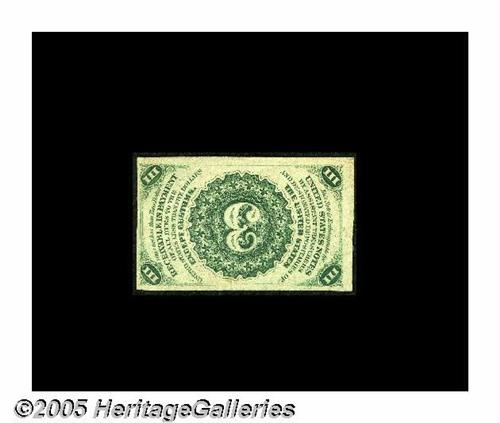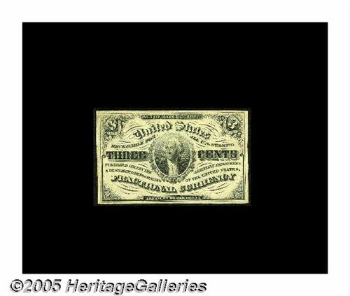<B>Fr. 1226 Milton 3R3.1b 3¢ Third Issue Inverted Back Extremely Fine.</B></I> A lovely and very rare Three Cent Invert, the note is well-margined on both sides, clean, bright and beautifully printed. It has only a few light folds, none of which breaks the ink. At the time the Encyclopedia was printed, only four examples were known, and we believe only one other has surfaced since then. In the 1924 Valentine book, the author claims that the 3¢ Inverts are from plate number 2, a misconception apparently created as the plate number on plate 2 is inverted. This piece realized $715 eight years ago when we sold Milt's Collection, a number that it should handily double this evening.
