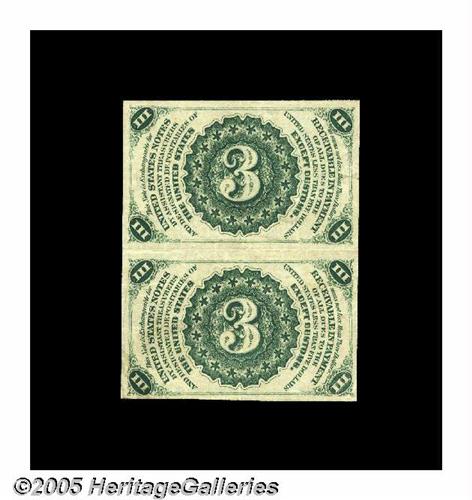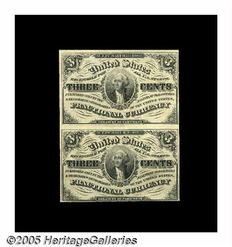 <B>Fr. 1226 Milton 3R3.1c 3¢ Third Issue About New.</B></I> This nice Vertical Pair is one of the few known multiples of the "No Pearls" variety, missing the two little circular decorations beneath the diamond at the bottom center of the Washington portrait. This variation, although minor, has always been of interest to collectors, and it was mentioned in Fractional literature as early as the 1890's. Research has indicated that this variety is missing from only two face plates: numbers 32 and 35.