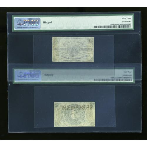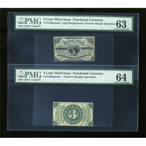 <B>Fr. 1226SP 3c Third Issue Narrow Margin Pair PMG Choice Uncirculated 63 & 64.</B></I> Both specimen notes exhibit some hinge residue on the backs.<BR><BR><b>Shipping:</b> Coins & Currency (<a target="_blank" href="http://www.heritageauctions.com/common/shipping.php">view shipping information</a>)