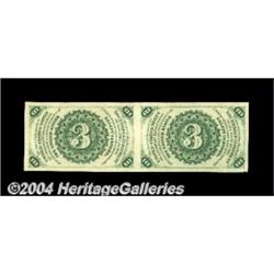 Fr. 1227 3c Third Issue Horizontal Pair Very Choice New. Dark Curtain Multiples are very seldom seen, and this is one of the nicest we've handled. We sold it once before, in October of 1995. In that sale, it was estimated at $250-up, and it realized just over $300. Both notes on an individual basis, and the pair itself as a whole, are quite near full Gem quality. 2 notes <BR><BR><B>Important notice:</B> Heritage usually auctions material at the rate of 200-250 lots per hour. On some occasions eBay Live bid software or the Internet may not be able to keep up with the pace of the auction. We recommend placing a realistic absentee bid now as insurance to avoid disappointment. Occasionally the auctioneer may eliminate or reject an eBay Live bid, and the auctioneer may also reopen a lot after the close of the eBay live bidding (usually because we missed an audience bid), and may reject your bid even if it shows you as the winning bidder. By bidding via eBay Live, you agree that Heritage may award the lot to another bidder at its sole discretion under the circumstances described above or any other reasonable circumstances. Since eBay bids are not shown to us until we open the lot on the floor, we treat those bids just like floor bids. In most cases the floor responds before the eBay bid is presented to us, due to Internet lag time, so for consistency we have made it a policy that floor bids are always considered first over tie eBay live bids. Also please note that all Heritage lots purchased through eBay Live carry a 20% Buyer's Premium. Please make sure you read the Terms and Conditions before you bid. <BR><BR><B>IMPORTANT ANNOUNCEMENT ABOUT RESERVES:</B> Heritage now divulges all reserves on its web site 7 days before every auction. If you want to know whether the reserve on this lot has been met, and if not, what the reserve amount is, please visit this lot page on the HeritageCoin.com web site, or email: bid@HeritageGalleries.com