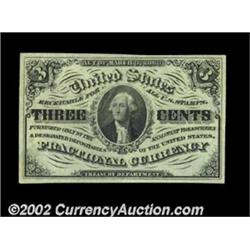 Fr. 1227 3c Third Issue Very Choice New. This Dark Curtain 3c flirts with the Gem grade. It's a strictly original piece, with good centering of both sides, sharp printing and ideal colors. Light Curtain 1226's are often found this nice, but it's unusual for a Dark to come better than New. Important notice: We expect to be auctioning lots at the rate of 200-250 per hour. Sometimes eBay Premier live bid software cannot keep up with that pace, so we strongly recommend that you place a realistic proxy bid now as insurance to avoid disappointment. Also please note that all Heritage/CAA lots purchased through eBay Premier carry a 20% Buyer's Premium. Please make sure you read the Terms and Conditions.