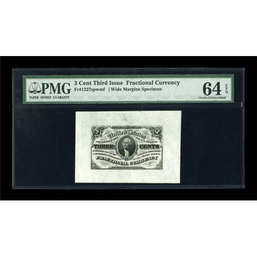 <B>Fr. 1227SP 3¢ Third Issue Wide Margin Pair PMG Choice Uncirculated 64 EPQ.</B></I> Both Face and Back are fully wide. The Back has the bronze "SPECIMEN" on its blank back inverted, which is relatively common for these. Nice Wide Margin 3¢ Pairs have become very difficult to locate in the market.<BR><BR><b>Shipping:</b> Coins & Currency (<a target="_blank" href="http://www.heritageauctions.com/common/shipping.php">view shipping information</a>)