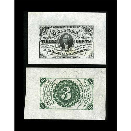 <B>Fr. 1227SP 3¢ Third Issue Wide Margin Pair.</B></I> The face is a beautiful Gem New example, and the back has a single, light diagonal fold as well as a few small pinholes. Both pieces are fully bright and fully wide. The back is printed on CSA paper, with two full letters visible; the face appears to be on CSA paper, but the watermark has missed the note.<BR><BR><b>Shipping:</b> Coins & Currency (<a target="_blank" href="http://www.heritageauctions.com/common/shipping.php">view shipping information</a>)