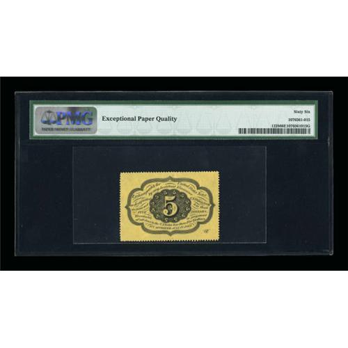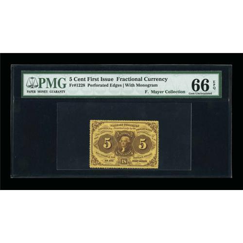 <B>Fr. 1228 5¢ First Issue PMG Gem Uncirculated 66 EPQ.</B></I> Bright, fully perforated and extremely well printed, this little jewel should please even the fussiest collector. CAA previously sold this note as part of the Phil DeRosa Collection in 1996. It realized $335 on an estimate of $300-up at that time. (1000-up)<BR><I>From The Frederick Mayer Collection</B></I><BR><BR><b>Shipping:</b> Coins & Currency (<a target="_blank" href="http://www.heritageauctions.com/common/shipping.php">view shipping information</a>)