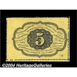 Fr. 1228 5c First Issue Gem New. An unusually nice example with two full strips of margin outside of the perforations. The colors are completely fresh, and the note would be absolutely superb if the back centering were just a touch better. An exceptional example. <BR><BR><B>Important notice:</B> Heritage usually auctions material at the rate of 200-250 lots per hour. On some occasions eBay Live bid software or the Internet may not be able to keep up with the pace of the auction. We recommend placing a realistic absentee bid now as insurance to avoid disappointment. Occasionally the auctioneer may eliminate or reject an eBay Live bid, and the auctioneer may also reopen a lot after the close of the eBay live bidding (usually because we missed an audience bid), and may reject your bid even if it shows you as the winning bidder. By bidding via eBay Live, you agree that Heritage may award the lot to another bidder at its sole discretion under the circumstances described above or any other reasonable circumstances. Since eBay bids are not shown to us until we open the lot on the floor, we treat those bids just like floor bids. In most cases the floor responds before the eBay bid is presented to us, due to Internet lag time, so for consistency we have made it a policy that floor bids are always considered first over tie eBay live bids. Also please note that all Heritage lots purchased through eBay Live carry a 20% Buyer's Premium. Please make sure you read the Terms and Conditions before you bid. <BR><BR><B>IMPORTANT ANNOUNCEMENT ABOUT RESERVES:</B> Heritage now divulges all reserves on its web site 7 days before every auction. If you want to know whether the reserve on this lot has been met, and if not, what the reserve amount is, please visit this lot page on the HeritageCoin.com web site, or email: bid@HeritageGalleries.com