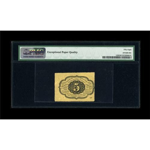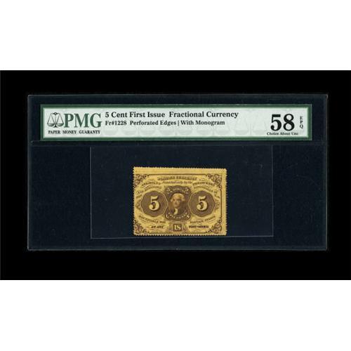 <B>Fr. 1228 5c First Issue PMG Choice About Unc 58 EPQ.</B></I> This note, most likely from the top of the sheet, displays an interesting cut.<BR><BR><b>Shipping:</b> Coins & Currency (<a target="_blank" href="http://www.heritageauctions.com/common/shipping.php">view shipping information</a>)