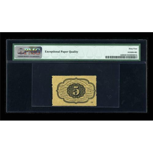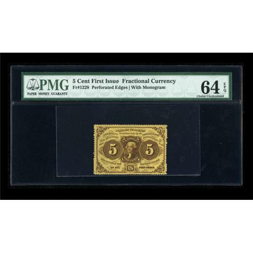 <B>Fr. 1228 5c First Issue PMG Choice Uncirculated 64 EPQ.</B></I> The margins are solid enough for a Gem grade though the front to back centering is a little off.<BR><BR><b>Shipping:</b> Coins & Currency (<a target="_blank" href="http://www.heritageauctions.com/common/shipping.php">view shipping information</a>)