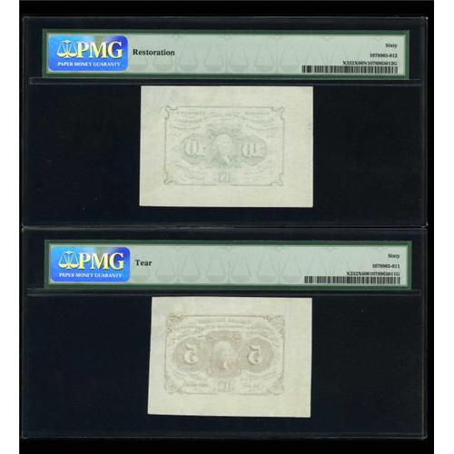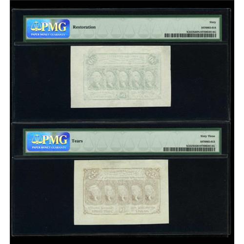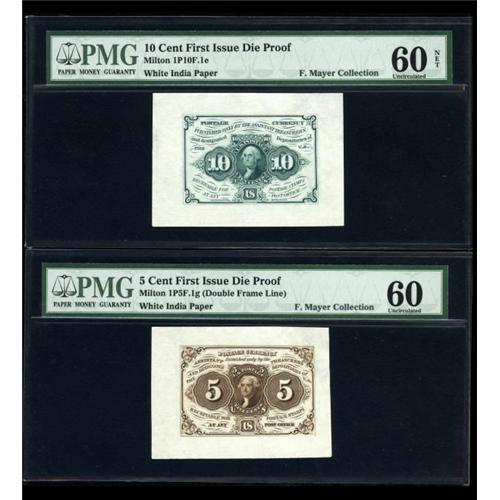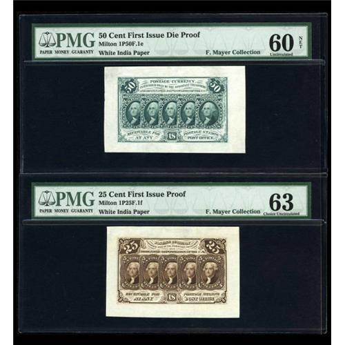 <B>Superb First Issue Die Proof Set. Milton 1P5F.1g, 1P10F.1e, 1P25F.1f and 1P50F.1e.</B></I> This grouping comes from the Frederick Mayer Collection and each of the four notes has a razor-sharp impression from the brand-new master plate. They were Lot 16354 from our O'Mara Sale in May of 2005, and they are extremely similar to Lot 867 from our January 1997 Friedberg Sale, but they lack the punch holes at the bottom of the designs. The 25c note has a few minor pinholes, and the rest of the set has some very minor faults but is essentially as-issued, and they are simply magnificent. Each of the Proofs is printed on very thin, soft, white India paper that exhibits the parallel striped watermarks indicative of laid paper. All four notes have the quality of printing that is usually seen only in Specimen books. A gorgeous set from finished plates. The 10c, 25c and 50c are exactly as issued, and the 5c has only the very minor difference of a double frameline outside the design. PMG has graded the notes 60, 60, 63 and 60.<BR><BR><b>Shipping:</b> Coins & Currency (<a target="_blank" href="http://www.heritageauctions.com/common/shipping.php">view shipping information</a>)