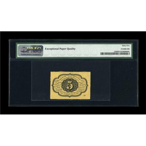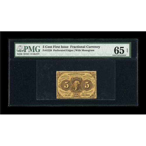 <B>Fr. 1228 5c First Issue PMG Gem Uncirculated 65 EPQ.</B></I> The colors are completely fresh, and the note would be absolutely superb if the bottom margin were just a touch better. An exceptional example destined for a premium collection.<BR><BR><b>Shipping:</b> Coins & Currency (<a target="_blank" href="http://www.heritageauctions.com/common/shipping.php">view shipping information</a>)