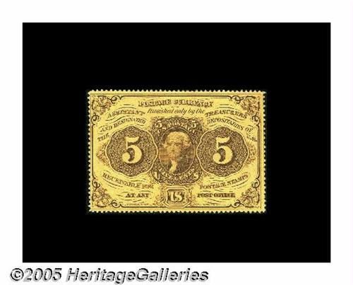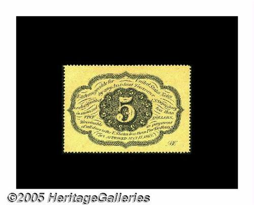 <B>Fr. 1228 Milton 1R5.3a 5¢ First Issue Gem New.</B></I> This beautiful Perforated Five Cent note is listed as Milton 1R5.3a. It's printed on the orange-yellow paper in dark, red-brown ink. Although the left edge of the face is somewhat tight, the perforations are so deep and perfect all around that calling this 100% original note anything less than Gem would be a real disservice. It's a superlative piece that should please even the fussiest of collectors.