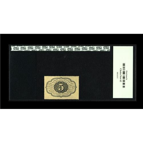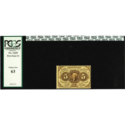 <B>Fr. 1229 5¢ First Issue PCGS Choice New 63.</B></I> This perforated no-monogram Five Cent appears to be kept at 63 by its face centering, with its extra-large bottom and left margins and slightly tight top and right. A very scarce note, especially so in this high a grade.