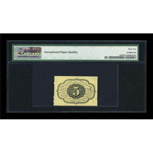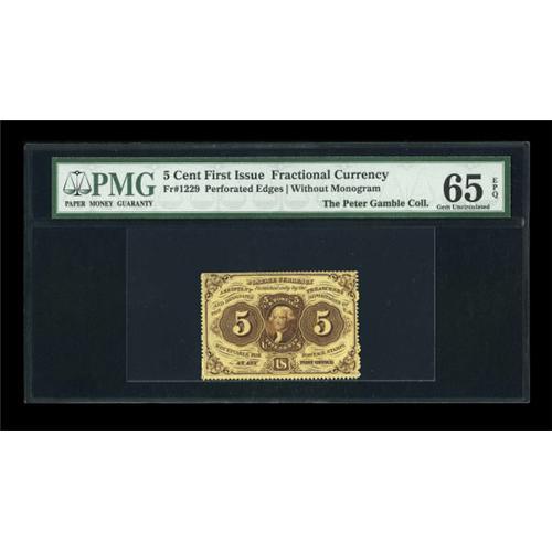 <B>Fr. 1229 5¢ First Issue PMG Gem Uncirculated 65 EPQ.</B></I> Fully perforated on three sides, but the top edge has shallow perfs at the right and tapers down to a straight edge at the left. The colors are excellent as is the paper originality. In the photograph it will appear that the left and right perforations are not complete; however, with the note in hand it is clear that they are. Little circular discs formed by the perforation machine have failed to fall out in a number of places creating the appearance of an imperfectly perforated piece.<BR><I>From The Peter Gamble Collection.</B></I><BR><BR><b>Shipping:</b> Coins & Currency (<a target="_blank" href="http://www.heritageauctions.com/common/shipping.php">view shipping information</a>)