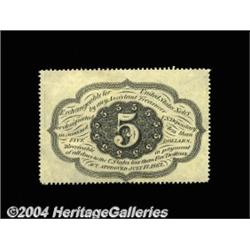Fr. 1229 5c First Issue Choice About New. Nicely margined and fully perforated all around, with excellent color and good eye appeal. A scarce and underrated note. Very hard to find this nice. <BR><BR><B>Important notice:</B> Heritage usually auctions material at the rate of 200-250 lots per hour. On some occasions eBay Live bid software or the Internet may not be able to keep up with the pace of the auction. We recommend placing a realistic absentee bid now as insurance to avoid disappointment. Occasionally the auctioneer may eliminate or reject an eBay Live bid, and the auctioneer may also reopen a lot after the close of the eBay live bidding (usually because we missed an audience bid), and may reject your bid even if it shows you as the winning bidder. By bidding via eBay Live, you agree that Heritage may award the lot to another bidder at its sole discretion under the circumstances described above or any other reasonable circumstances. Since eBay bids are not shown to us until we open the lot on the floor, we treat those bids just like floor bids. In most cases the floor responds before the eBay bid is presented to us, due to Internet lag time, so for consistency we have made it a policy that floor bids are always considered first over tie eBay live bids. Also please note that all Heritage lots purchased through eBay Live carry a 20% Buyer's Premium. Please make sure you read the Terms and Conditions before you bid. <BR><BR><B>IMPORTANT ANNOUNCEMENT ABOUT RESERVES:</B> Heritage now divulges all reserves on its web site 7 days before every auction. If you want to know whether the reserve on this lot has been met, and if not, what the reserve amount is, please visit this lot page on the HeritageCoin.com web site, or email: bid@HeritageGalleries.com