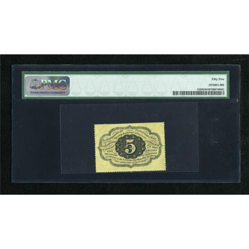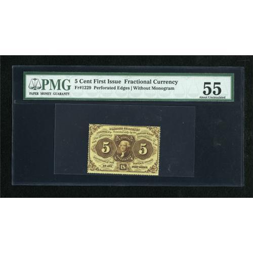 <B>Fr. 1229 5c First Issue PMG About Uncirculated 55.</B></I> This note is perforated on three sides.<BR><BR><b>Shipping:</b> Coins & Currency (<a target="_blank" href="http://www.heritageauctions.com/common/shipping.php">view shipping information</a>)