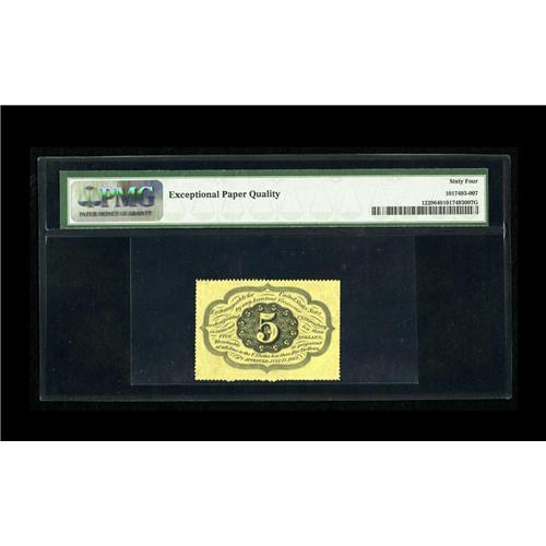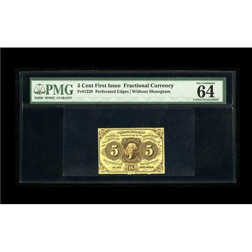 <B>Fr. 1229 5c First Issue PMG Choice Uncirculated 64 EPQ.</B></I> A fresh and vibrantly colored example of the scarce no monogram variety. The perforations are fully present on three sides and partially present at left.<BR><BR><b>Shipping:</b> Coin/Currency (<a target="_blank" href="http://www.heritageauctions.com/common/shipping.php">view shipping information</a>)