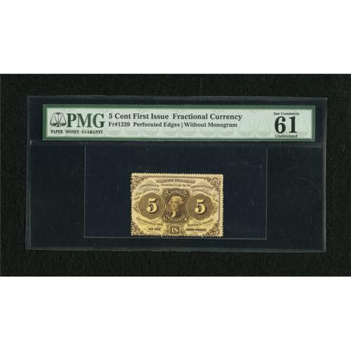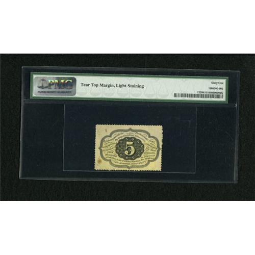 <B>Fr. 1229 5c First Issue PMG Uncirculated 61.</B></I> "Tear Top Margin" and "Staining" are the PMG comments given to this scarce no monogram perforated note.<BR><BR><b>Shipping:</b> Coins & Currency (<a target="_blank" href="http://www.heritageauctions.com/common/shipping.php">view shipping information</a>)