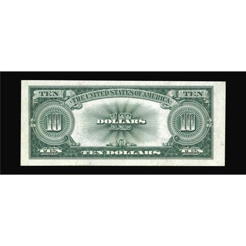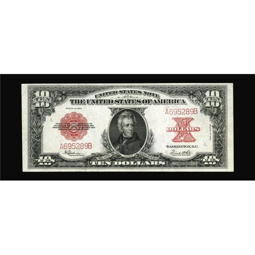 <B>Fr. 123 $10 1923 Legal Tender Gem New.</B></I> The margins on this Jackson $10 are as wide as one would expect for a Gem, and the centering is almost letter perfect. Though the embossing is weak, the colors on the overprint are bright and complementary. Gem examples of this type aren't common, and nice ones are usually snapped up by appreciative type collectors.<BR><I>From The Plymouth Rock Collection</B></I>