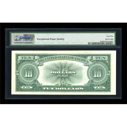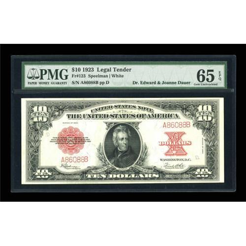 <B>Fr. 123 $10 1923 Legal Tender PMG Gem Uncirculated 65 EPQ.</B></I> Most all Uncirculated examples of this note come from a few known runs including the final pack. This note, unusually, stands by itself; it is a random survivor in pristine condition. The margins are broad all the way around and the centering of both sides is excellent. The colors are also outstanding. Both sides of this note are pictured on page 93 of the Dauers' reference work, along with a brief biography of Andrew Jackson. The same portrait of Jackson that was utilized for this note remains in use today on our modern $20. <BR><I>From The Dr. Edward & Joanne Dauer Collection</B></I><BR><BR><b>Shipping:</b> Coins & Currency (<a target="_blank" href="http://www.heritageauctions.com/common/shipping.php">view shipping information</a>)