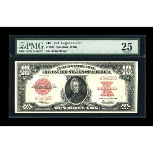 <B>Fr. 123 $10 1923 Legal Tender PMG Very Fine 25.</B></I> This moderately circulated Poker Chip note is decently margined with the overprint retaining much of its overall color.<BR><BR><b>Shipping:</b> Coins & Currency (<a target="_blank" href="http://www.heritageauctions.com/common/shipping.php">view shipping information</a>)