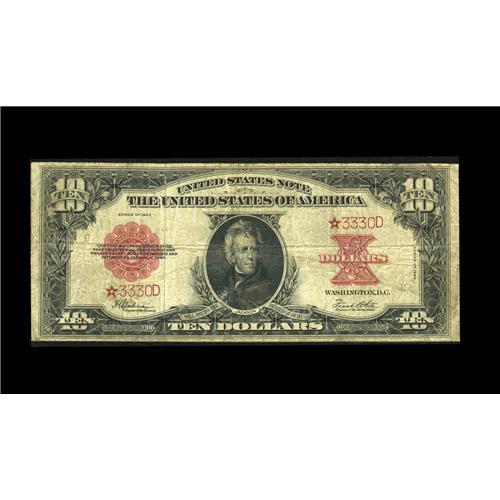 <B>Fr. 123 $10 1923 Legal Tender Star Note Fine.</B></I> This auction marks the first appearance of either of the two recorded Fr. 123 stars at public sale in over a dozen years. Your cataloguer discovered this note some thirty years ago, and since that time it has had only three owners, including the current consignor. Just two examples of this star are known, a figure that has not changed in the intervening three decades, and, with the interval between the arrival of new pieces, the likelihood is that no more remain to be discovered. The other known Fr. 123 star is ensconced in the strongest of hands, and unlikely to be available to collectors for many years to come, making this the sole opportunity for any collector to achieve completion of a star note set by type. With the market for true numismatic rarities reaching record levels at every offering of same, we see no reason why this note, a legitimate rarity with only two examples known, should not reach or exceed...