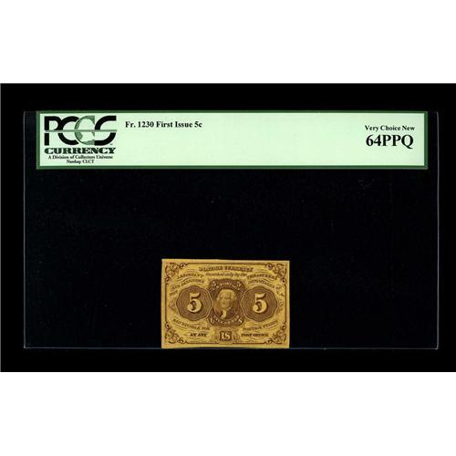 <B>Fr. 1230 5¢ First Issue PCGS Very Choice New 64PPQ.</B></I> Quite close to the full Gem grade.<BR><I>From The Bill and Kathy Stella Currency Collection</B></I><BR><BR><b>Shipping:</b> Coin/Currency (<a target="_blank" href="http://www.heritageauctions.com/common/shipping.php">view shipping information</a>)