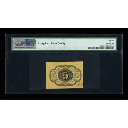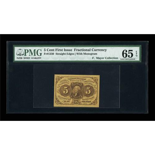 <B>Fr. 1230 5¢ First Issue PMG Gem Uncirculated 65 EPQ.</B></I> Huge margins and good centering along with razor-sharp print quality make this a highly desirable Fractional note.<BR><I>From The Frederick Mayer Collection</B></I><BR><BR><b>Shipping:</b> Coins & Currency (<a target="_blank" href="http://www.heritageauctions.com/common/shipping.php">view shipping information</a>)