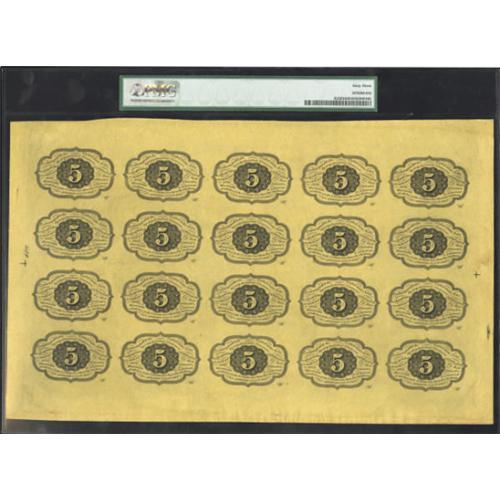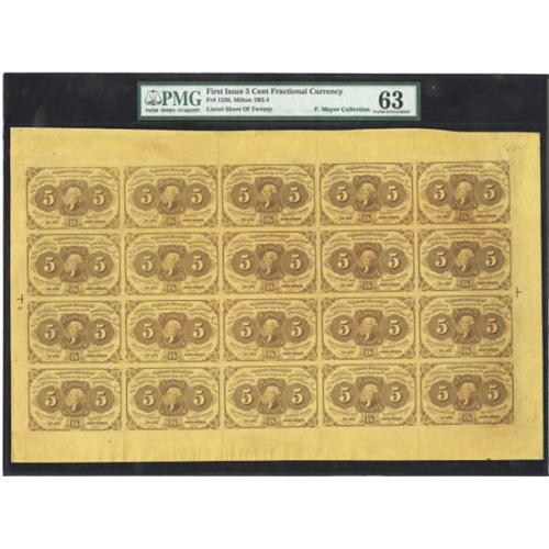 <B>Fr. 1230 5¢ First Issue Complete Sheet of 20 PMG Choice Uncirculated 63.</B></I> A handsome and unusually bright First Issue Five Cent Sheet. The margins are fully wide, and the original embossing is deep enough so that is can be readily seen through the PMG holder. Fractional sheets in uncirculated condition have become very difficult to acquire over the past few years. The demand from collectors is constantly increasing, while the supply has diminished as sheets are being cut to produce high-grade singles. (5000-up)<BR><I>CAA Friedberg January 1997 Lot 486.</B></I><BR><I>From The Frederick Mayer Collection</B></I><BR><BR><b>Shipping:</b> Coins & Currency (<a target="_blank" href="http://www.heritageauctions.com/common/shipping.php">view shipping information</a>)