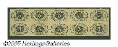 <B>Fr. 1230 5¢ First Issue Strip of Ten Extremely Fine.</B></I> This strip saw some light circulation as a 50¢ piece. The notes are bright, and most would grade XF or AU individually. An unusual size block. It's the full length of the sheet by two notes high.