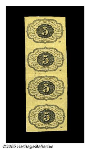 <B>Fr. 1230 5¢ First Issue Vertical Strip of Four Extremely Fine.</B></I> A bright First Issue strip folded between the notes.