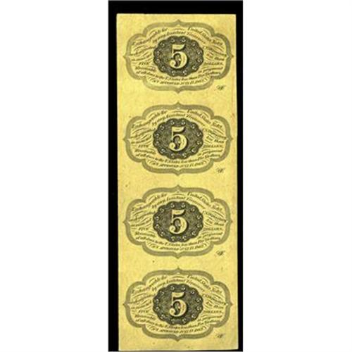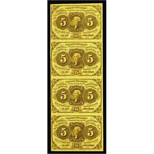 <B>Fr. 1230 5¢ First Issue Vertical Strip of Four Very Choice New.</B></I> There are a few handling marks, but all four notes on this lovely, original strip are high-grade, brightly colored pieces.